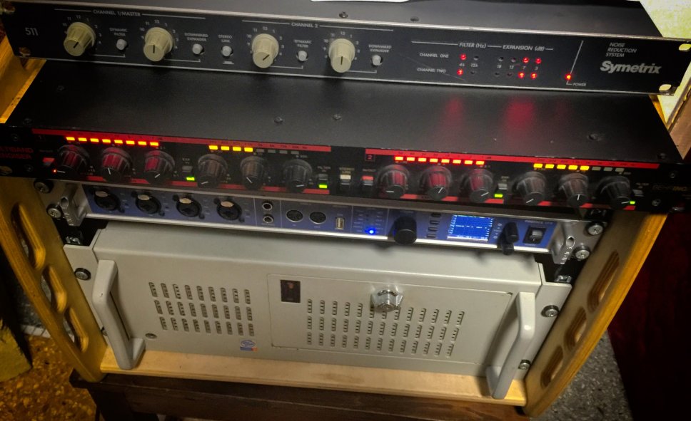 Quando abbiamo inserito i sistemi di riduzione in ascolto, abbiamo sentito forti perturbazioni quindi abbiamo optato per la riproduzione senza sistemi di riduzione del rumore, ma nella catena audio prima della conversione abbiamo inserito due sistemi analogici di riduzione di rumore: Symetrix 511 verso Behringer Multiband Denoiser (come vedete dal colore rosso su nero del frontale è della primissima serie, costruito in Germania!)