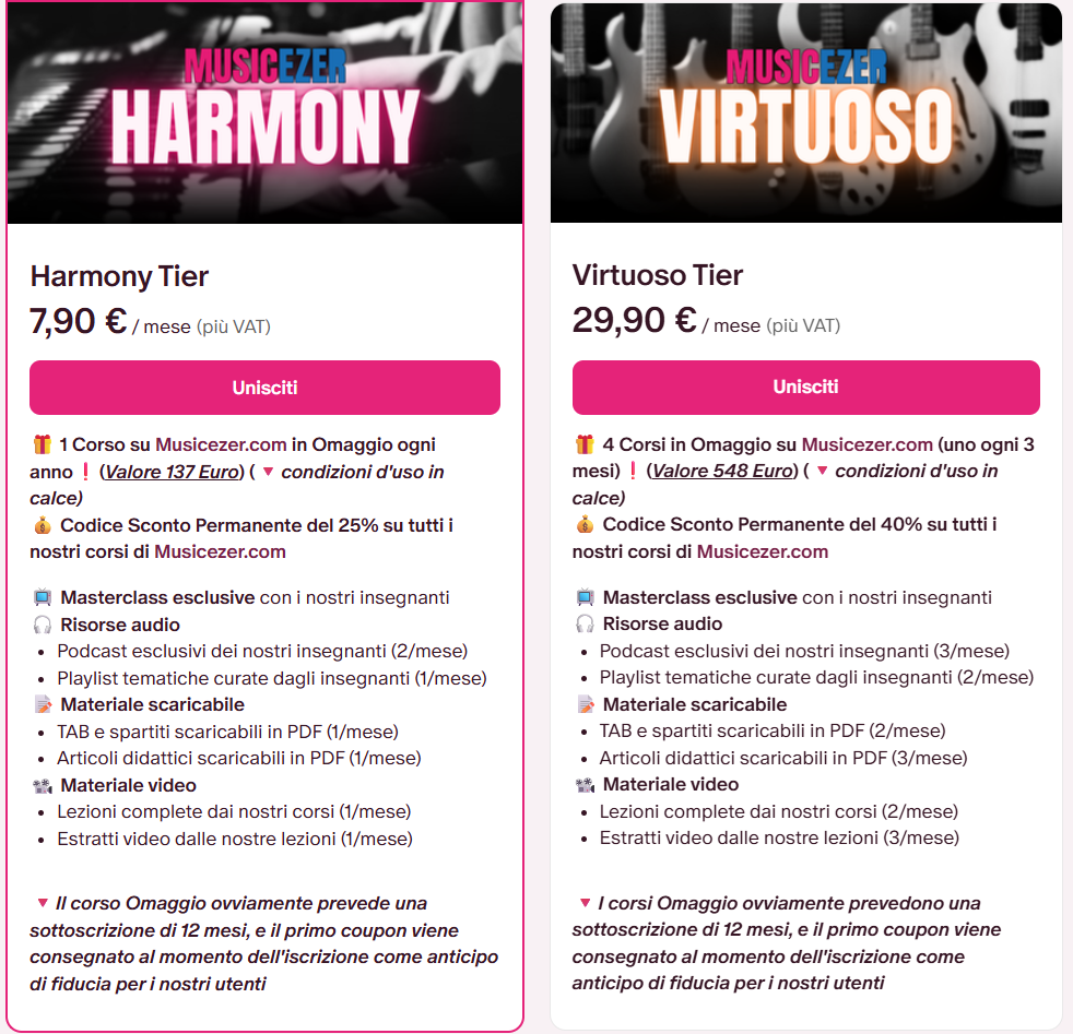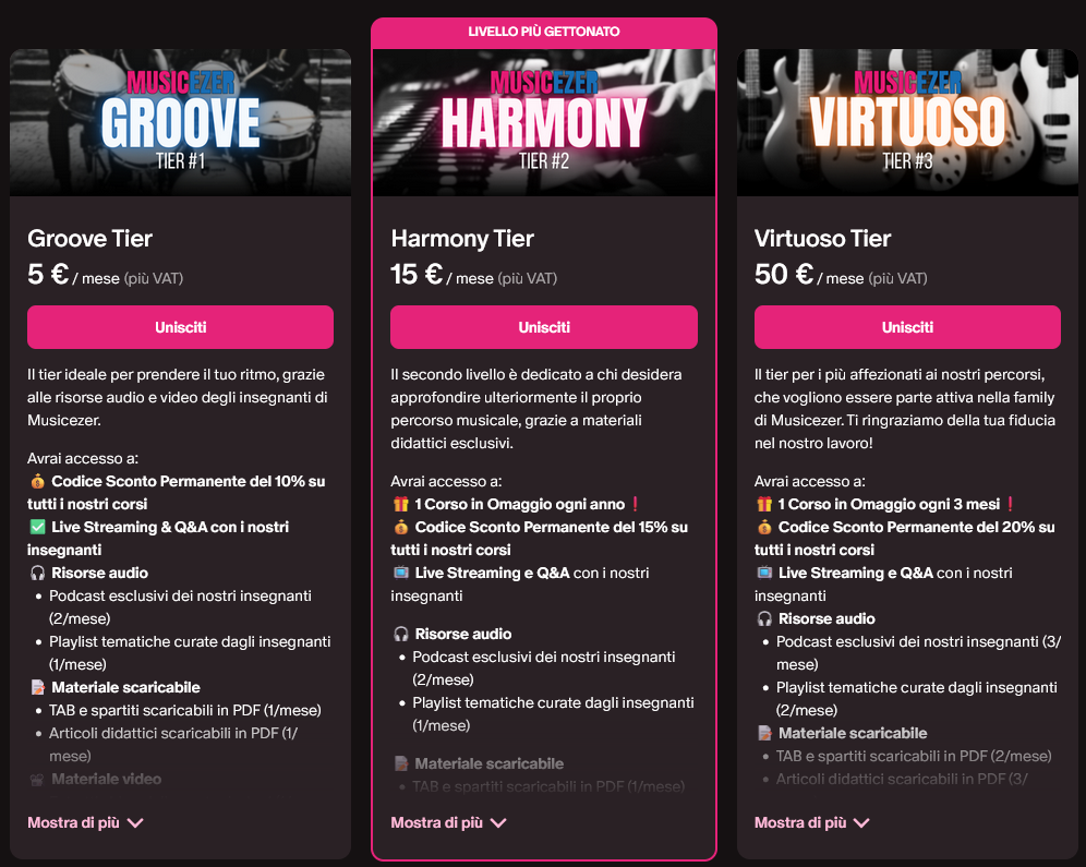 Tier a pagamento (Harmony e Virtuoso) – Qui le cose si fanno ancora più interessanti! Oltre a tutti i contenuti esclusivi, avrai anche:
