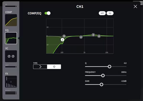 - I controlli dei parametri COMP, EQ e FX per i canali destro e sinistro sono collegati. (ogni parametro può essere modificato nella schermata CH1).