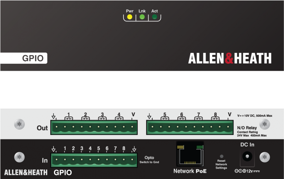 Il dispositivo è fornito di tre connettori Euro-block, uno per 8 ingressi opto-isolati e 2 per le 8 uscite con relay normalmente aperti (N/O); per la connessione Cat5 a dLive MixRack o Surface (entro 100m) è fornita una presa PoE (IEEE 802.3af-2003) ma l’alimentazione è disponibile anche tramite un alimentatore cc 12V.