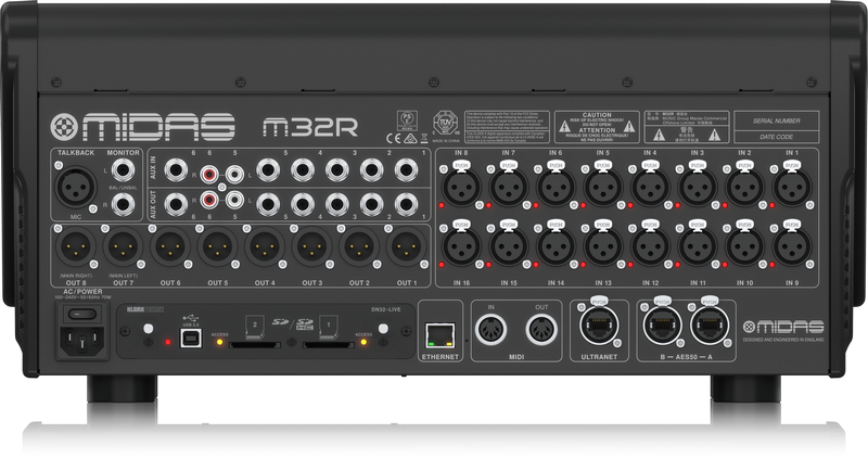 Midas propone ai professionisti, sia storici che nuovi, una soluzione integrata di grande appeal concepita con in mente lo slogan “Mind to Sound“: M32R Live è dotato di 40 canali di ingresso, con 16 pre MIDAS PRO e 25 percorsi di segnale per mix e registrazione dal vivo, con possibilità di registrare tramite USB 2.0 fino a 3h per 32 ingressi tramite il modulo opzionale Klark Teknik DN32-LIVE, che comprende anche due slot SD/SDHC e con una batteria può mantenere i file anche nel caso di improvvisa mancanza di corrente e prima della finalizzazione..