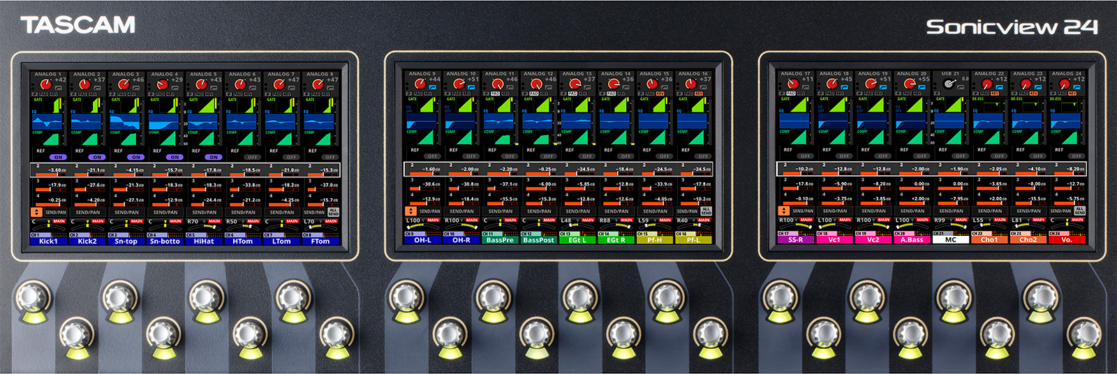 Entrambe le varianti utilizzano anche l’interfaccia utente VIEW (Visual Interactive Ergonomic Workflow) appena sviluppata da Tascam, che offre un controllo rapido su tutti i parametri tramite schermi tattili incorporati (due sulla Sonicview 16 e tre sulla Sonicview 24) e pulsanti programmabili dall’utente.