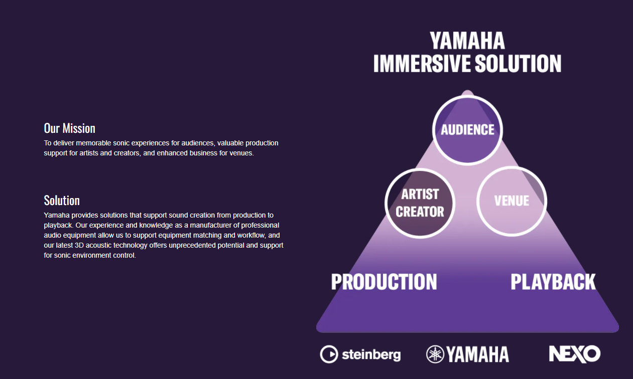 È evidente che per raggiungere questo obiettivo è indispensabile offrire soluzioni ottimali a tutti gli elementi coinvolti con l’integrazione totale delle fasi di pre-produzione, produzione e diffusIone sonora. Ciò è stato realizzato nel corso del tempo e si sta evolvendo con il contributo di aziende leader nei rispettivi settori grazie al gruppo di lavoro che nel tempo ha acquisito i background anche della software house Steinberg e dei diffusori NEXO.
