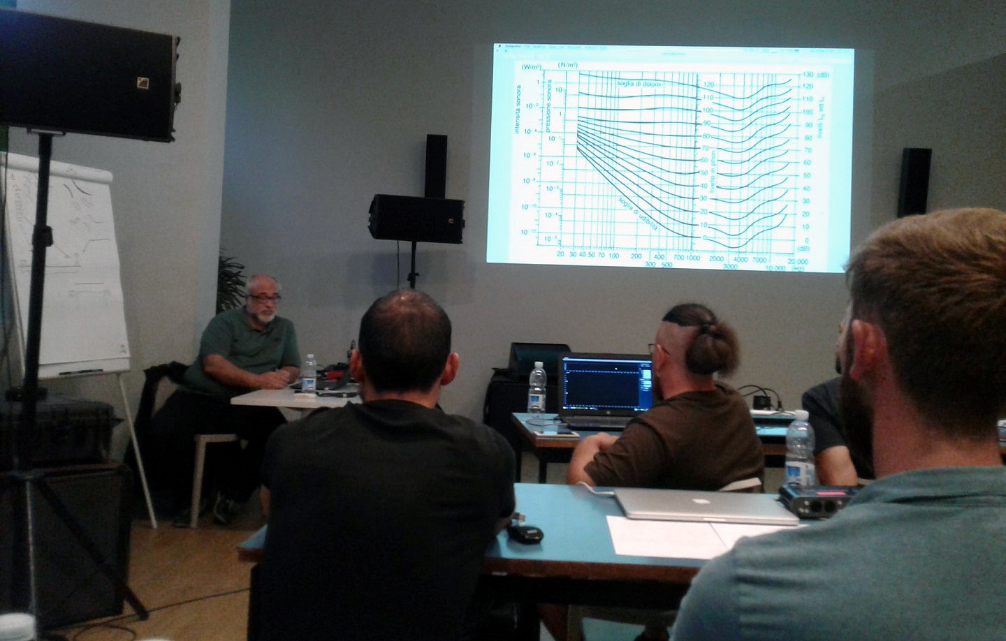 Sin dall’inizio Giuseppe è stato chiaro sugli intenti del corso: sfruttare alcuni brevi e indispensabili e richiami di teoria sulla fisica del suono per poi entrare diretti nell’ambito pratico.