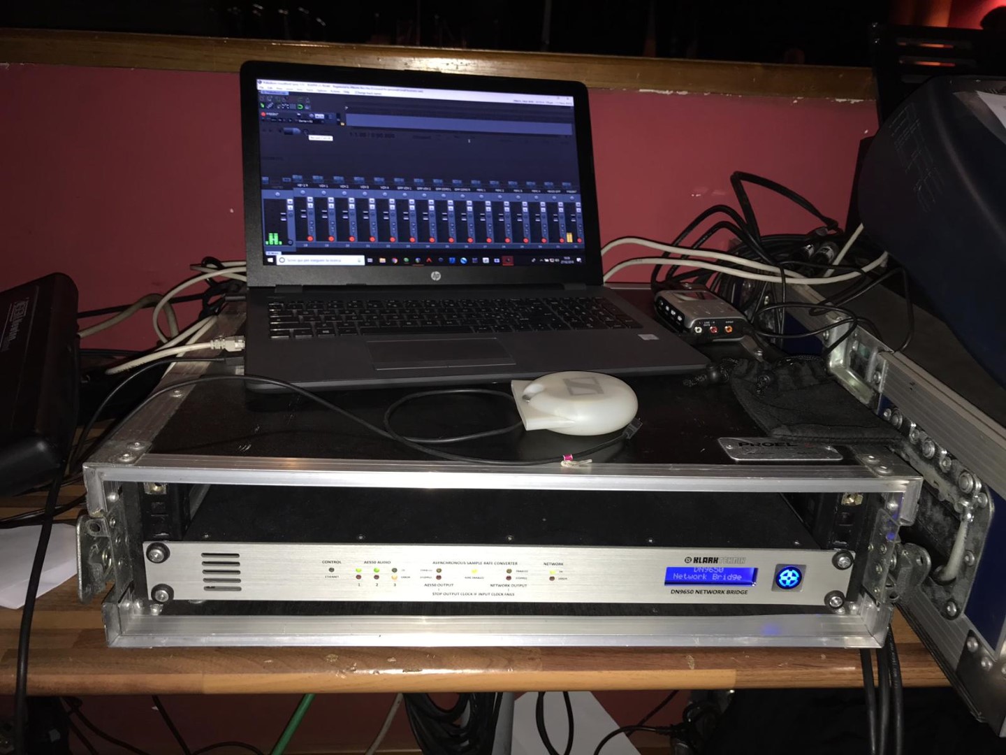 Un altro cablaggio CAT5e che è stato implementato, ma solo nell’allestimento, è stato quello tra il Midas PRO1 e la Klark Teknik DN9650, il network bridge che uso per convertire il flusso AES50 in Dante, in modo da poter usare il DVS (Dante Virtual Soundcard) installato sul mio PC.