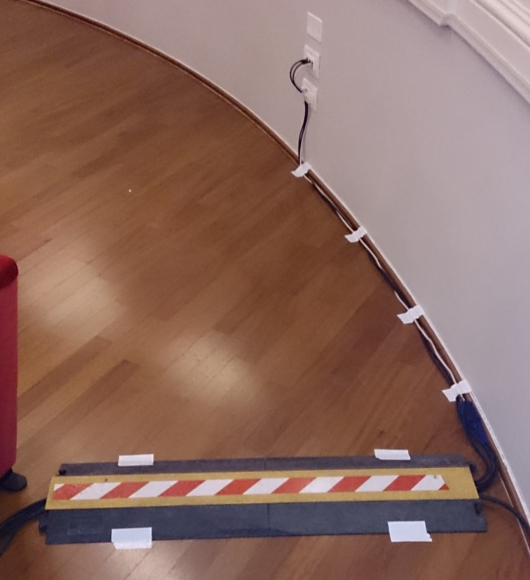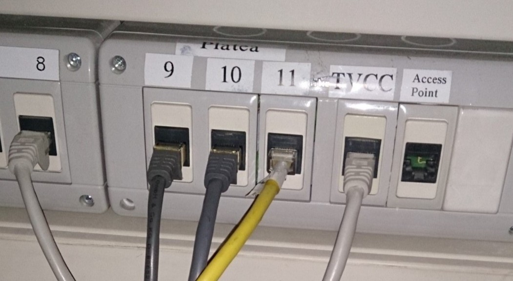 In foto possiamo vedere il cablaggio dei tre percorsi di rete CAT6 che abbiamo trovato, con immensa gioia, in un teatro che “miracolosamente” li metteva a disposizione; si intravede sulla destra, in blu, il Widget della Link a terra.