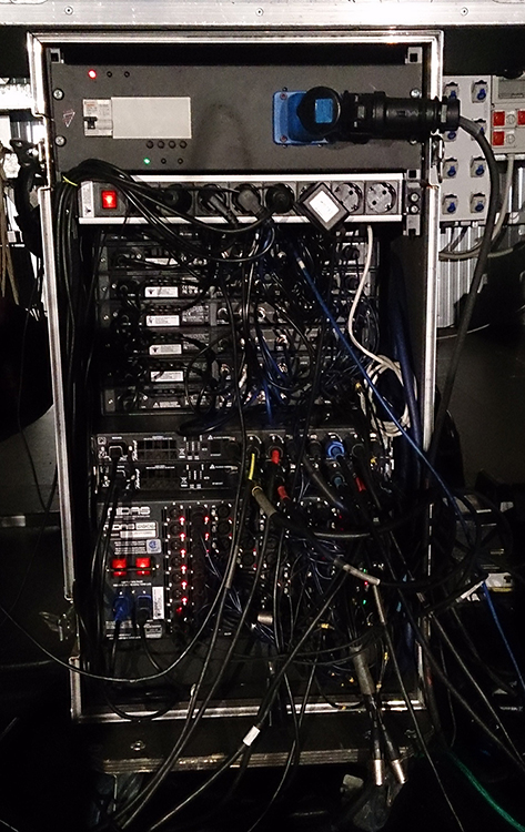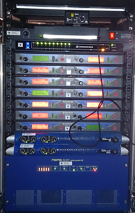 I ricevitori Sennheiser EW550G2 infatti, più numerosi delle le normali sorgenti, per evitare di perdere tempo in fase di montaggio, abbiamo preferito montarli nello stesso “frigorifero” della stage box Midas DL251, così da lasciare tutto precablato.