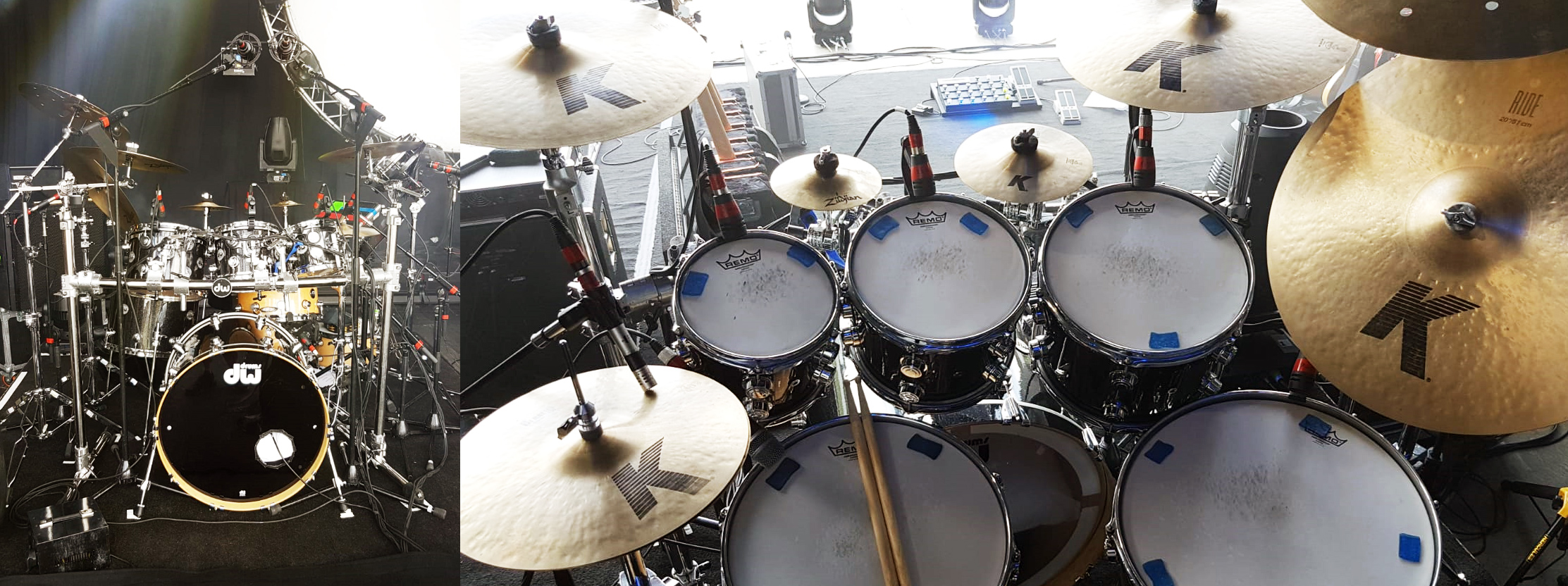Parlando di questi ultimi, io ho richiesto innanzitutto una fornitura di microfoni DPA D-Facto per le voci. Sulla batteria, il modello top di DW Drums equipaggiata con piatti Zildjian, uso Shure beta91 nella cassa, beta57 sul rullante, Sennheiser 604 su tom e cordiera, due AKG C451B e come overhead gli Audio-Technica AT4050.