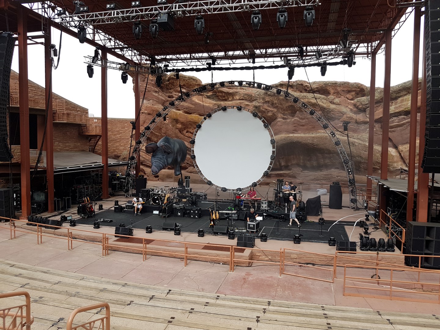 Sia nell’arco che nel cerchio viene montato come avrete forse intuito il telo per le proiezioni video che accompagnano la musica. Anche in questo caso preciso che in alcune situazioni, come la suddetta Red Rocks, non viene coperto lo spazio dell’arco (come vedete nella foto) per chiare ragioni scenografiche: l’ambientazione direi che parla da sola.