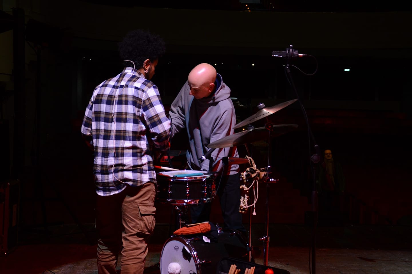 La batteria è stata plasmata durante l’allestimento per rispondere alle esigenze di scena, passando da una classica configurazione “5 pezzi” a un’insolita 2 pezzi suonata in piedi! La microfonazione, già di per se scarna, in modalità “jazz”, si è ridotta da 5 a 4 microfoni, ai quali si aggiungono i due canali di V-Drum e il canale del rullante “mobile”.