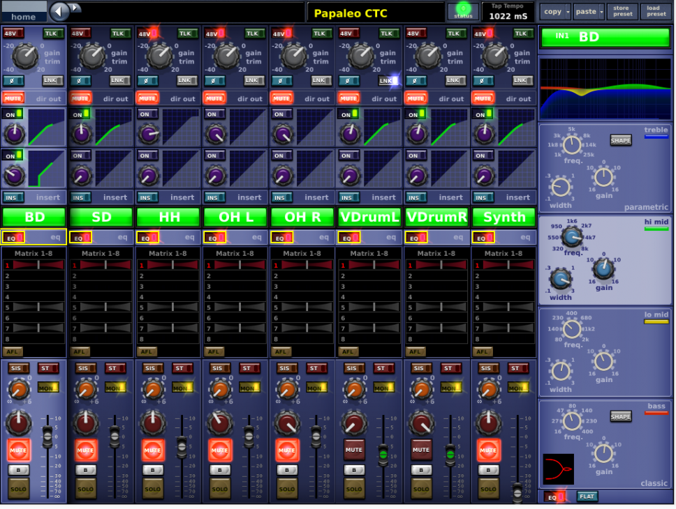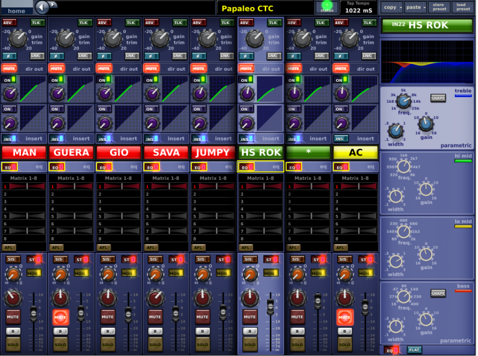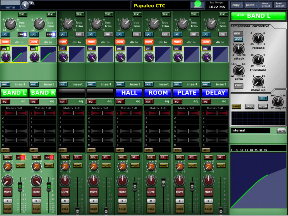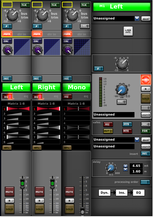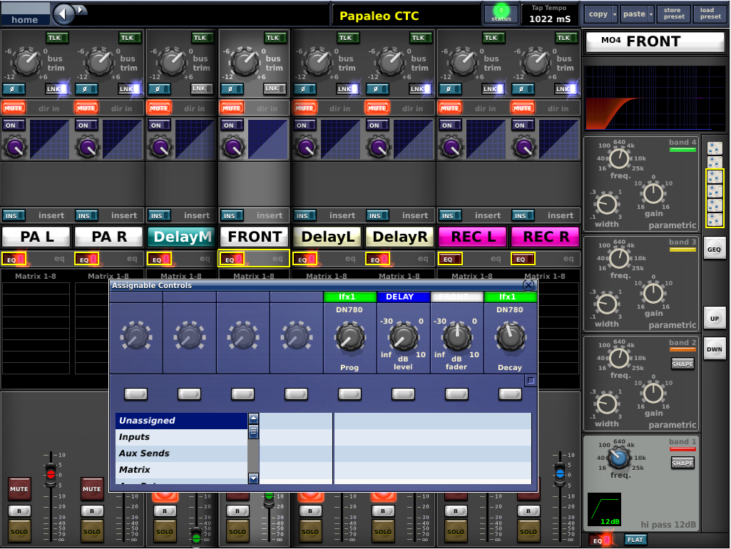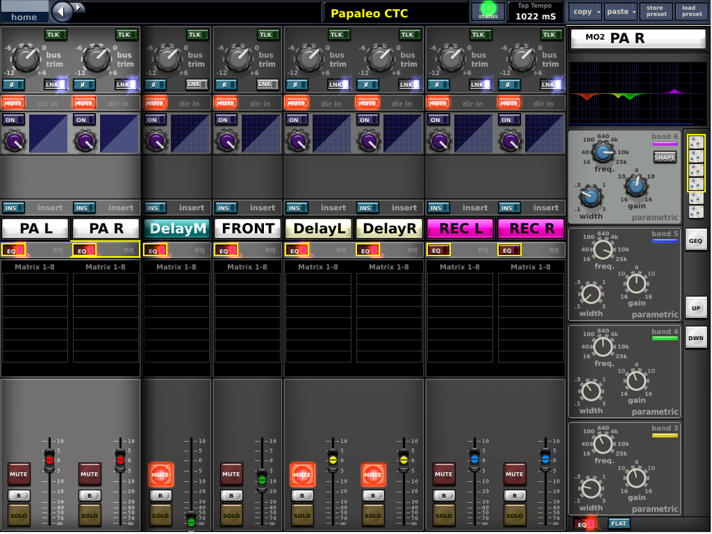 Sul mixer il PA è gestito da 6 matrici (due per il main L-R, una per i front mono, una per il delay mono e due per il delay stereo), più un paio extra per eventuali registrazioni, telecamere ecc. La sorgente è sempre il Master.