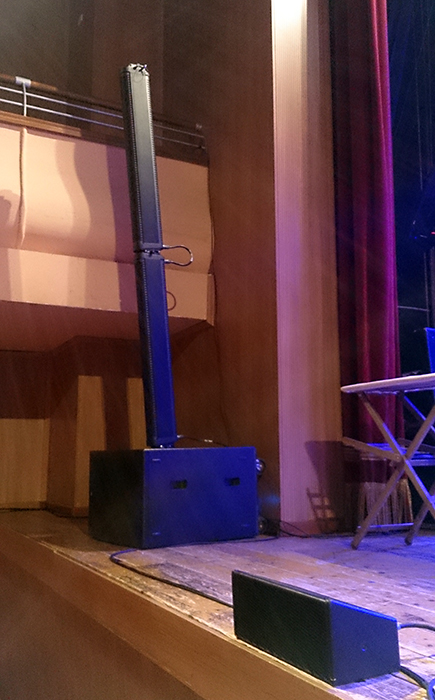 Parto dunque dall’installazione del PA, compito che tocca a me, mentre parallelamente Stefano Nuccetelli allestisce l’audio del palco. Chiaramente la disposizione e la quantità dei diffusori cambia di teatro in teatro, mediamente almeno un PA main L-R e un Front-Fill mono vengono piazzati.