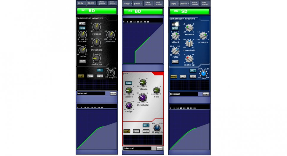 Per quanto riguarda le dinamiche siamo ai minimi, compressore leggero su cassa e rullante e un gate sulla cassa, inevitabile, a causa della posizione a filo palco della batteria.