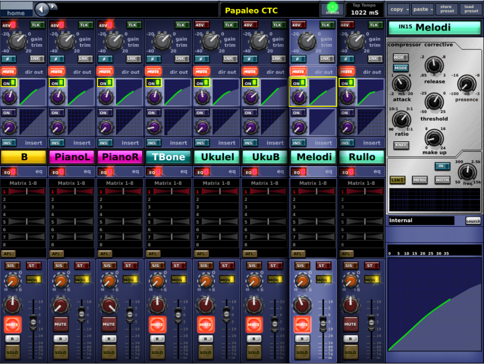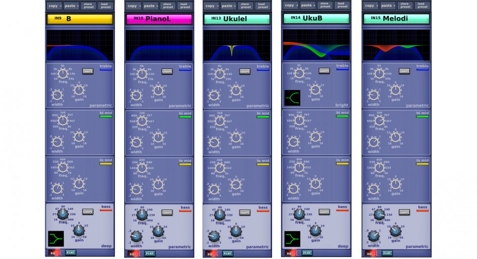 L’ukulele di Giorgio è stato opportunamente filtrato in basso, considerata la natura dello strumento, e controllato su una frequenza in cui c’era una risonanza particolarmente fastidiosa. Un’ulteriore attenuazione è stata fatta sul master Aux del suo ascolto, lui è uno che non ci va leggero sul monitor!