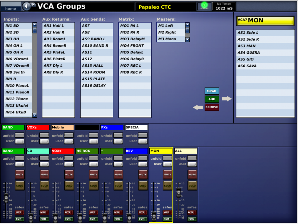 Infine, tutti i Mix che uso per la gestione degli ascolti, Aux pre-fader per capirci, sono sotto un VCA che chiamo “Mon”, che mi è utile per gestire il volume generale del palco, diverso di volta in volta.