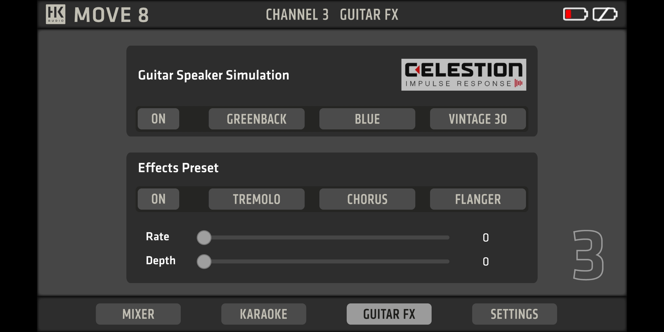 Ai chitarristi è offerto un interessante simulatore di altoparlanti con scelta fra tre iconici driver per chitarra Celestion: Greenback, Alnico Blue e Vintage 30, e oltre al riverbero sono disponibili tre effetti specifici, ossia tremolo, chorus e flanger, con parametri memorizzabili Rate e Depth.
