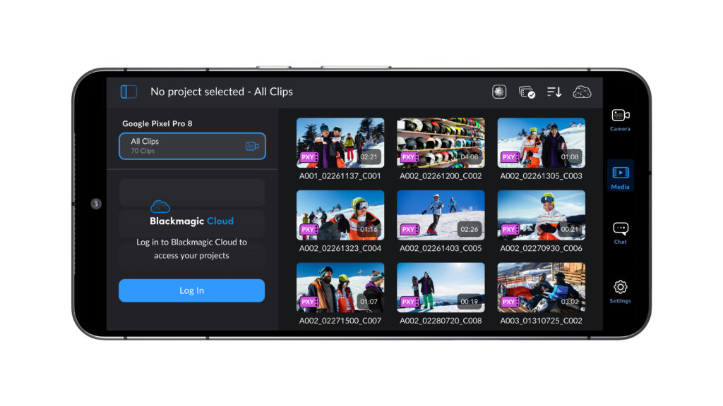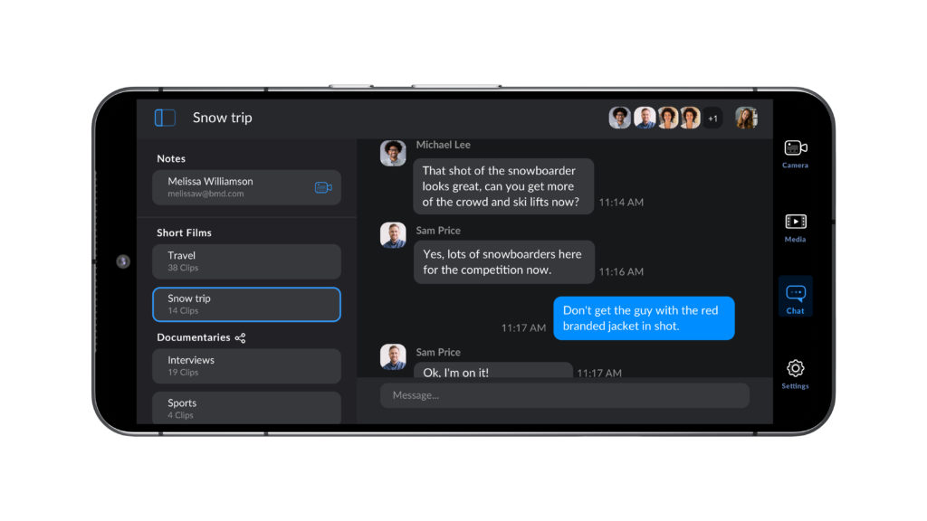 Lo spazio di lavoro di Blackmagic Camera integra una chat interna che consente ai membri del progetto, tramite Blackmagic Cloud, di discutere delle riprese e scambiare idee senza uscire dall’app.