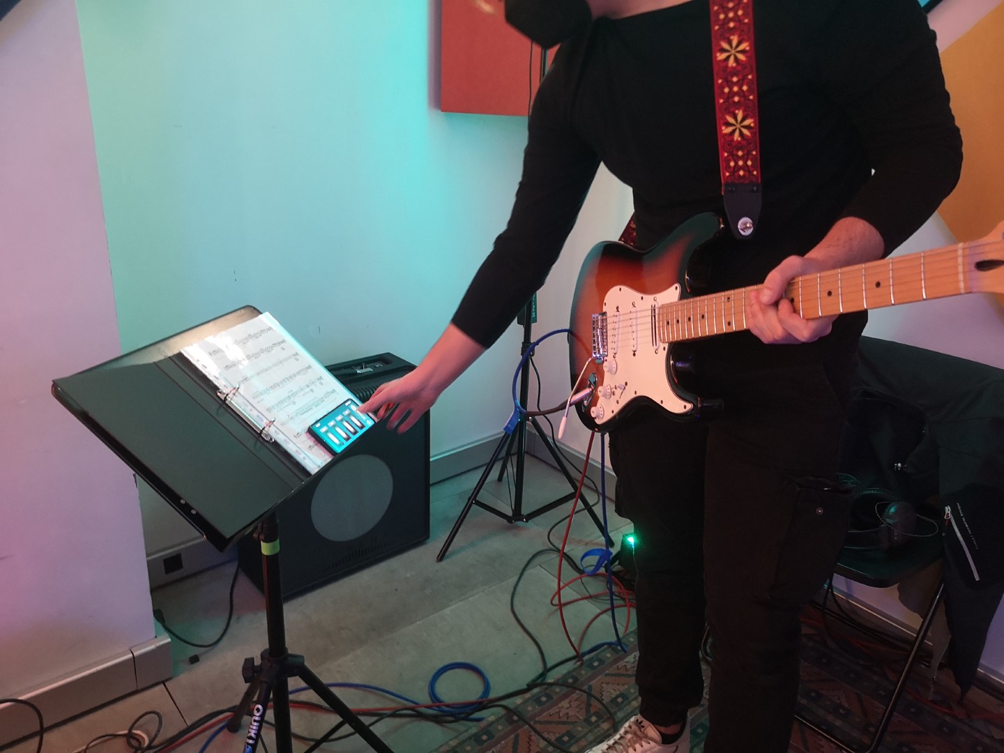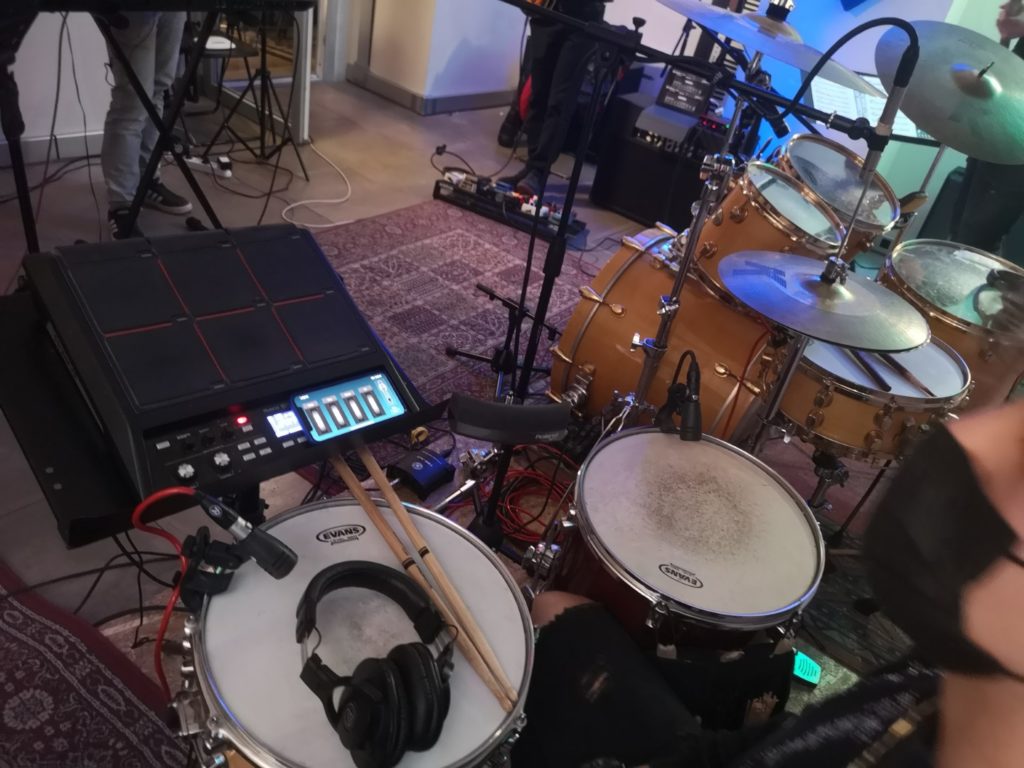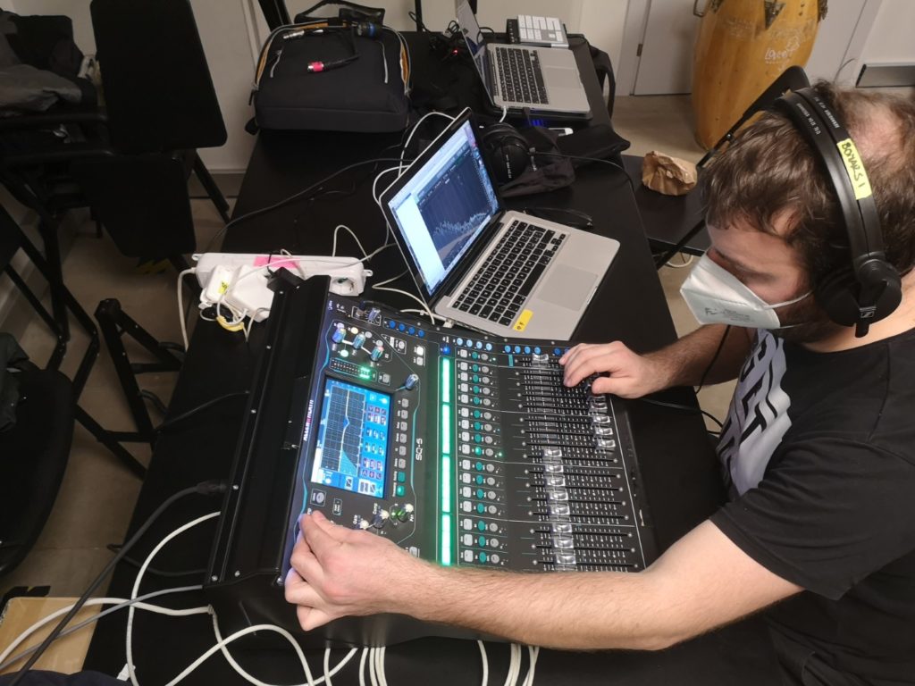 Eh sì, perchè com’è facile immaginare, in queste occasioni di live in streaming suonati nelle aule didattiche, meno “suono” c’è in giro meglio è! Ascolti in cuffia dunque per i musicisti, gestiti tramite collegamenti “a filo” tra amplificatore per cuffia e auricolari.