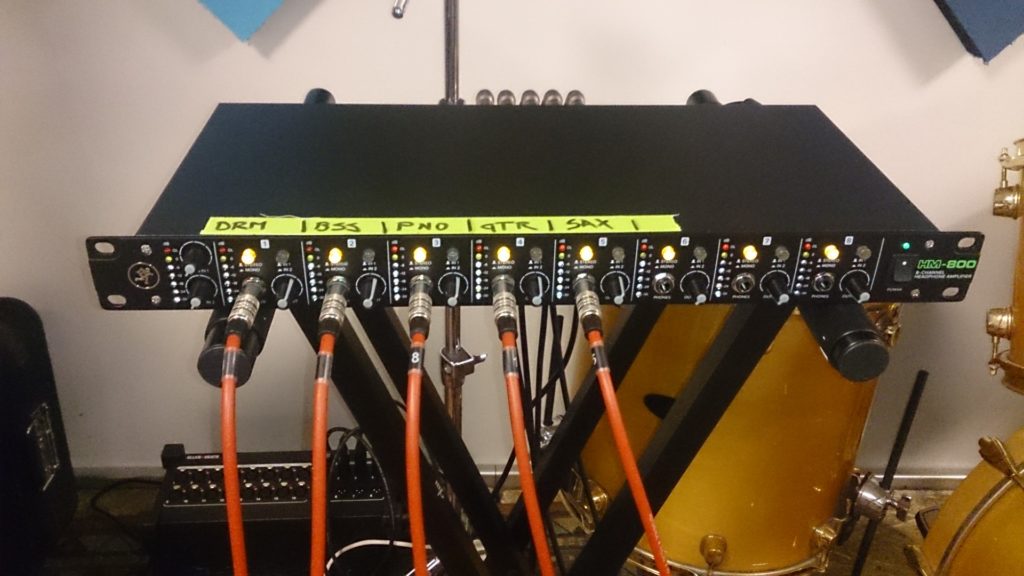 Riccardo ci mostra come è organizzato il setup di ascolto: il percorso del segnale è quello standard, ovvero l’uscita fisica delle Aux Pre (stereo o mono a seconda della situazione) dalla stage box A&H DX168 arriva all’ampli cuffia Mackie HM800, mentre le uscite cuffia, tramite prolunghe, arrivano agli auricolari/cuffie dei musicisti.