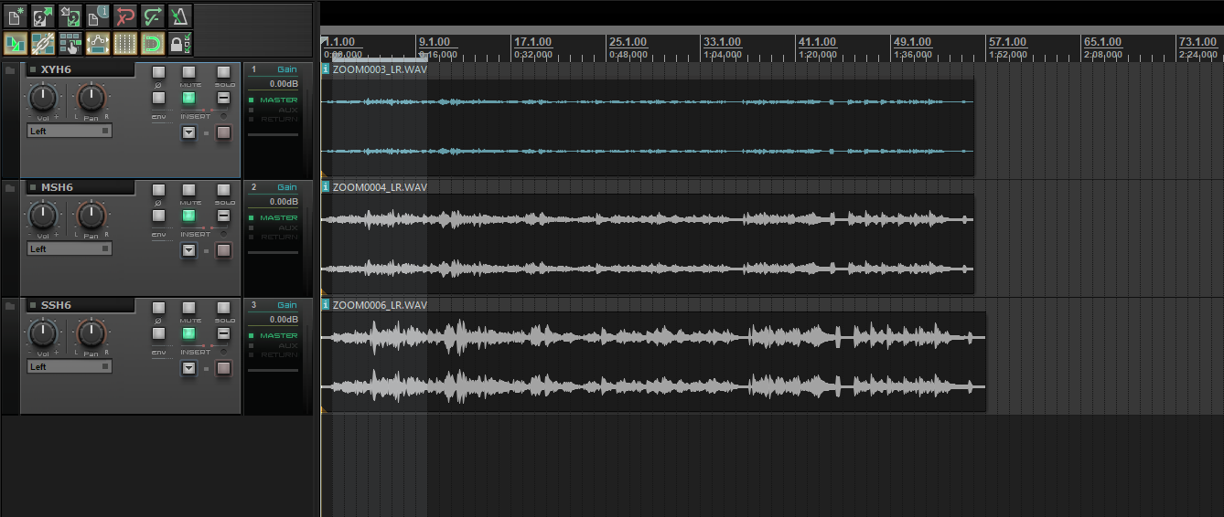 Il posizionamento del Q8 è stato a poco più di un metro di distanza, tutti i microfoni sono stati settati allo stesso livello di gain per meglio comprendere le differenze di ripresa. Possiamo notare la prima differenza mettendo a paragone le forme d’onda direttamente dal software di registrazione, vedendo la traccia appena registrata.