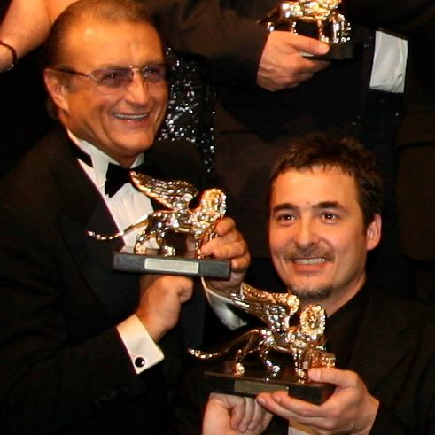 Marco Patrignani con il Leone D'Oro della Biennale di Venezia insieme a Tony Renis