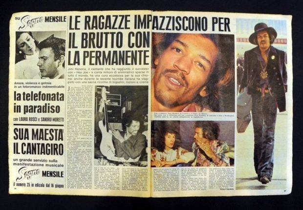 La sera del 23 maggio 1968 Jimi Hendrix si esibisce nel suo unico concerto a Milano, un bagno di folla. Il giorno dopo sui giornali compaiono titoli imbarazzanti come quello nella foto sotto oppure "Pazze per il mostro" o addirittura "Arriva il negro che suona la chitarra con i denti".