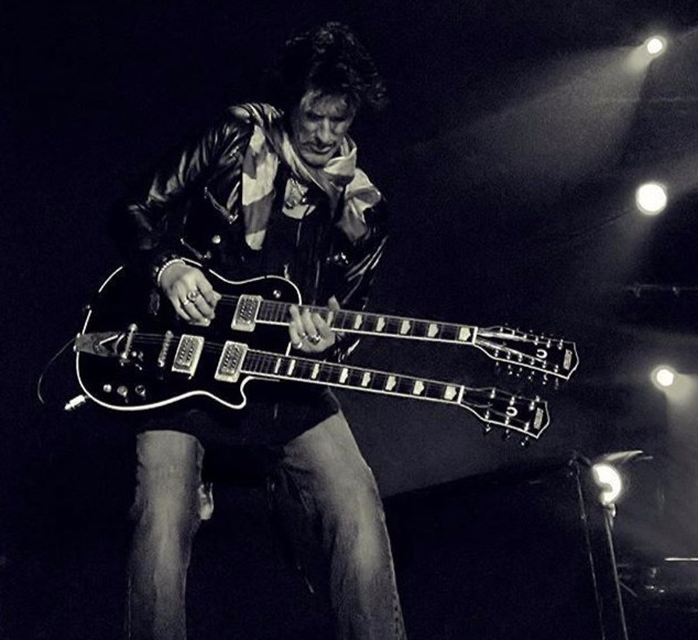 Nella foto sotto, ad esempio, lo vediamo con una meravigliosa Gretsch Duo Jet Double Neck, in un concerto con gli Aerosmith a Caracas.