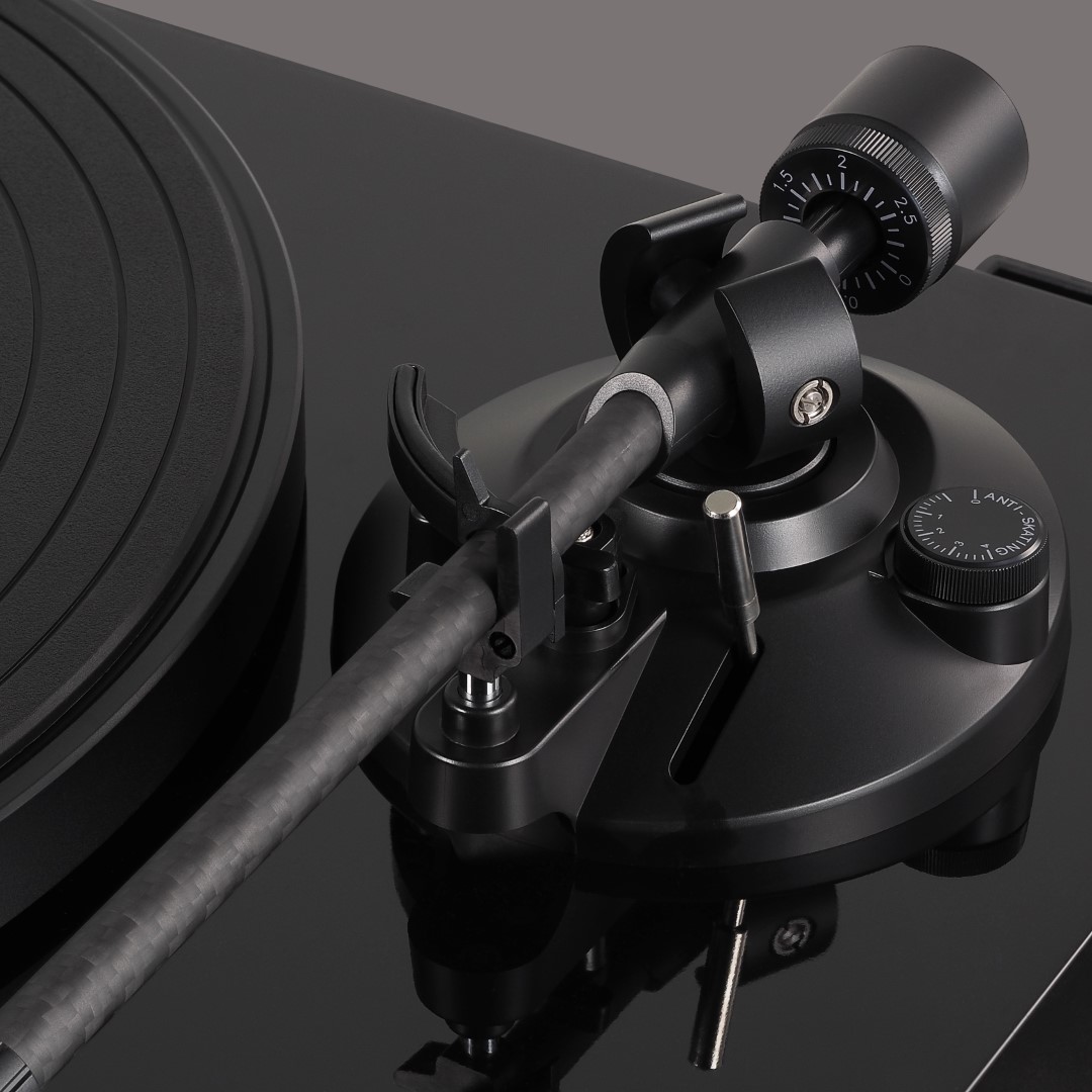 Il braccio è dritto e realizzato in fibra di carbonio e permette la regolazione del peso della testina (VTF). Troviamo poi anche la regolazione dell’antiskating, per un corretto bilanciamento delle forze che agiscono sul cantilever durante la riproduzione di un disco (solitamente va settato su valori uguali o simili al peso impostato sulla testina).