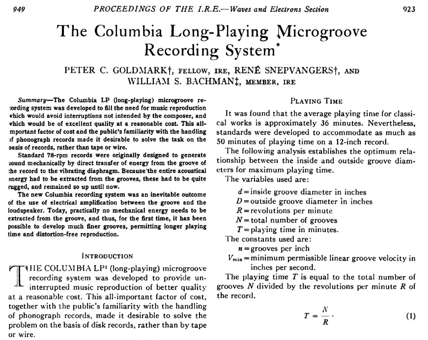 Proprio nello stesso anno Goldmark dichiarava: “A quei tempi il vinile veniva usato in via sperimentale per i dischi, ma la stessa materia prima era ancora molto costosa; tuttavia, quando abbiamo capito che si poteva mettere un’intera opera su un singolo disco, il costo del materiale sarebbe stato compensato. Per usare meno vinile dovevamo rendere i dischi più sottili. Ma quando i dischi sono stati resi più sottili, si sono verificati problemi di deformazione e si sono dovuti trovare nuovi modi per stabilizzare il disco, il che significa diversi tipi di pressioni.”