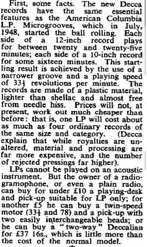 Gli LP non possono essere riprodotti su strumenti acustici. Tuttavia, il proprietario di un radiogrammofono o persino di una semplice radio può acquistare per meno di 10 sterline un giradischi con pick-up adatto agli LP; con 5 sterline in più, può acquistare un motore a doppia velocità (33⅓ e 78 giri) e un pick-up con due testine facilmente intercambiabili; oppure può optare per un “Deccalian” bifunzionale al costo di 37 sterline e 16 scellini, poco più del normale modello.