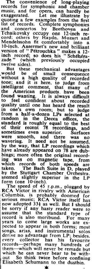 Ma il periodo della nostra neutralità è quasi terminato. Il mese prossimo Decca lancerà il primo catalogo inglese con circa cinquanta dischi LP, insieme a una varietà di apparecchiature per ascoltarli; sembra probabile che anche la Gramophone Company seguirà presto lo stesso percorso.