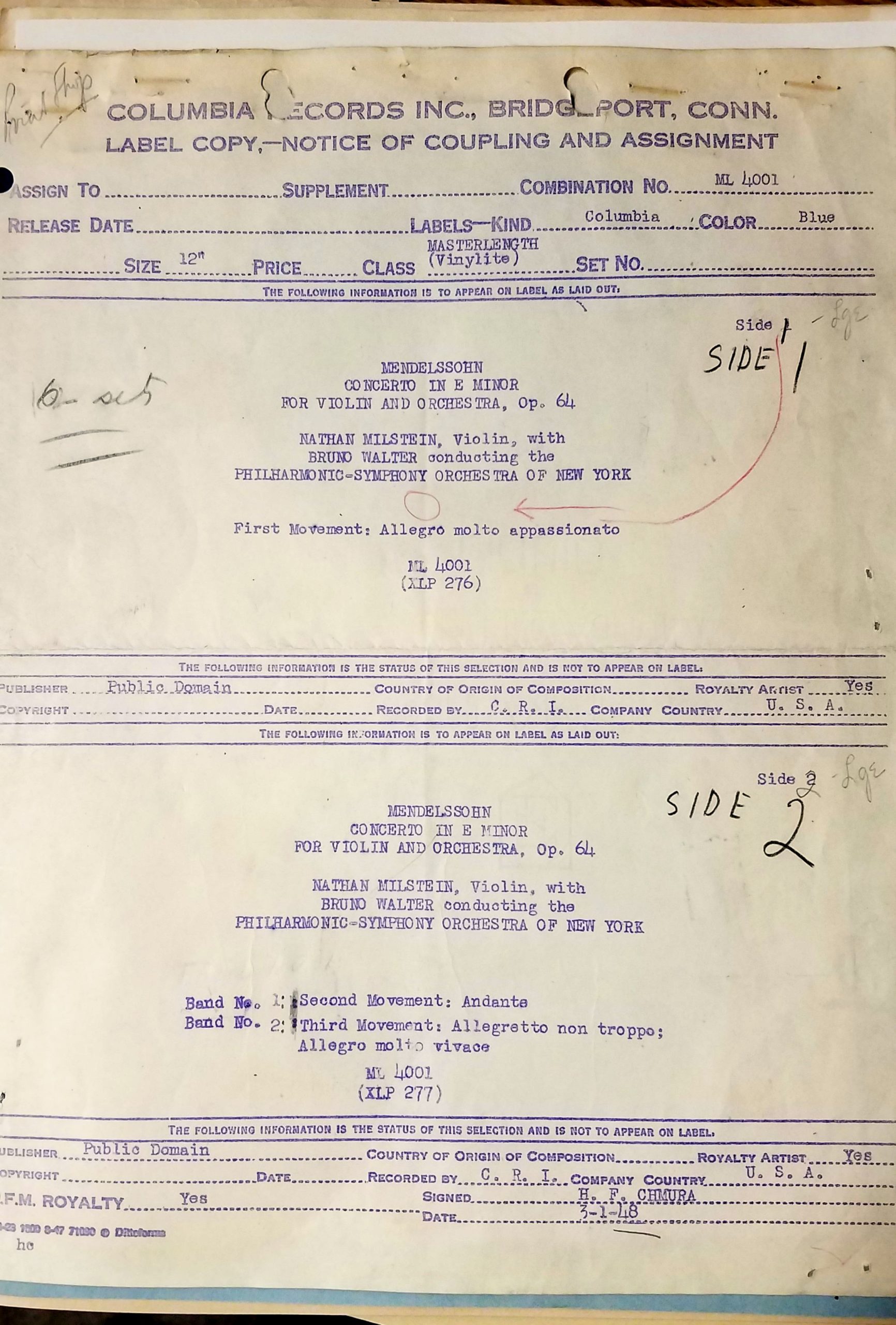 Si trattava dell’incisione del Concerto per violino di Mendelssohn, della durata totale di 45 minuti, su due lati di un disco da 12 pollici, il cosidetto LP ovvero “Long Playing“, che girava a 33⅓ giri al minuto.