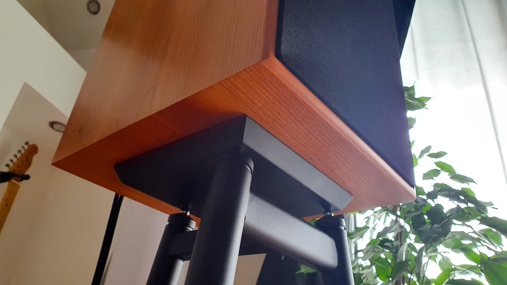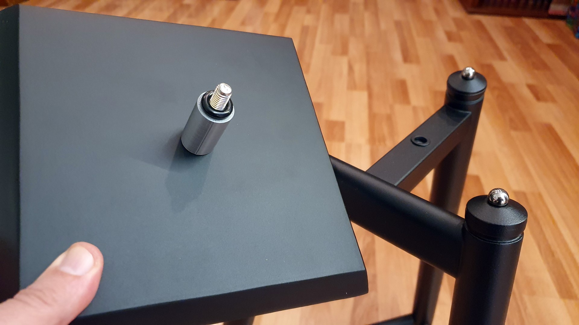 L’attenzione che dovrete porre in questa fase è quella di mettere i diffusori perfettamente paralleli al top plate dello stand e chiaramente entrambi allo stesso modo (io preferisco non mettere il plate proprio al centro della base del diffusore, ma lievemente avanzato visto che il peso maggiore della cassa è solitamente in corrispondenza degli altoparlanti frontali).