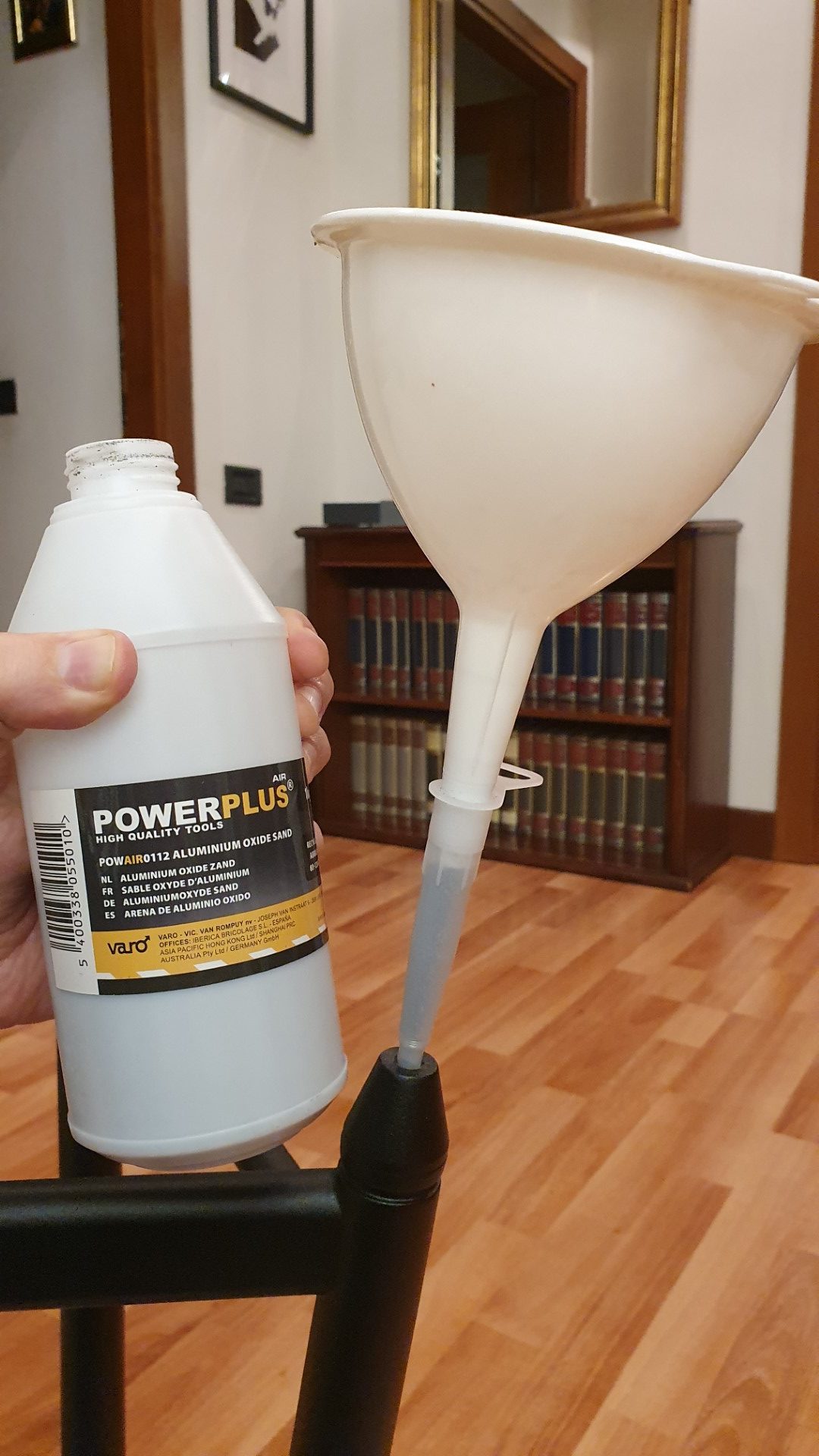 Allora personalmente ho scelto una soluzione alternativa, cioé la sabbia per sabbiatrice, che è una sabbia molto fine di materiale metallico comunemente usata con pistole ad aria compressa per le operazioni di sabbiatura. Chiaramente così usata, sparata ad altissima pressione, diventa abrasiva, ma se messa dentro a un contenitore e tenuta ferma, non dà alcun problema.
