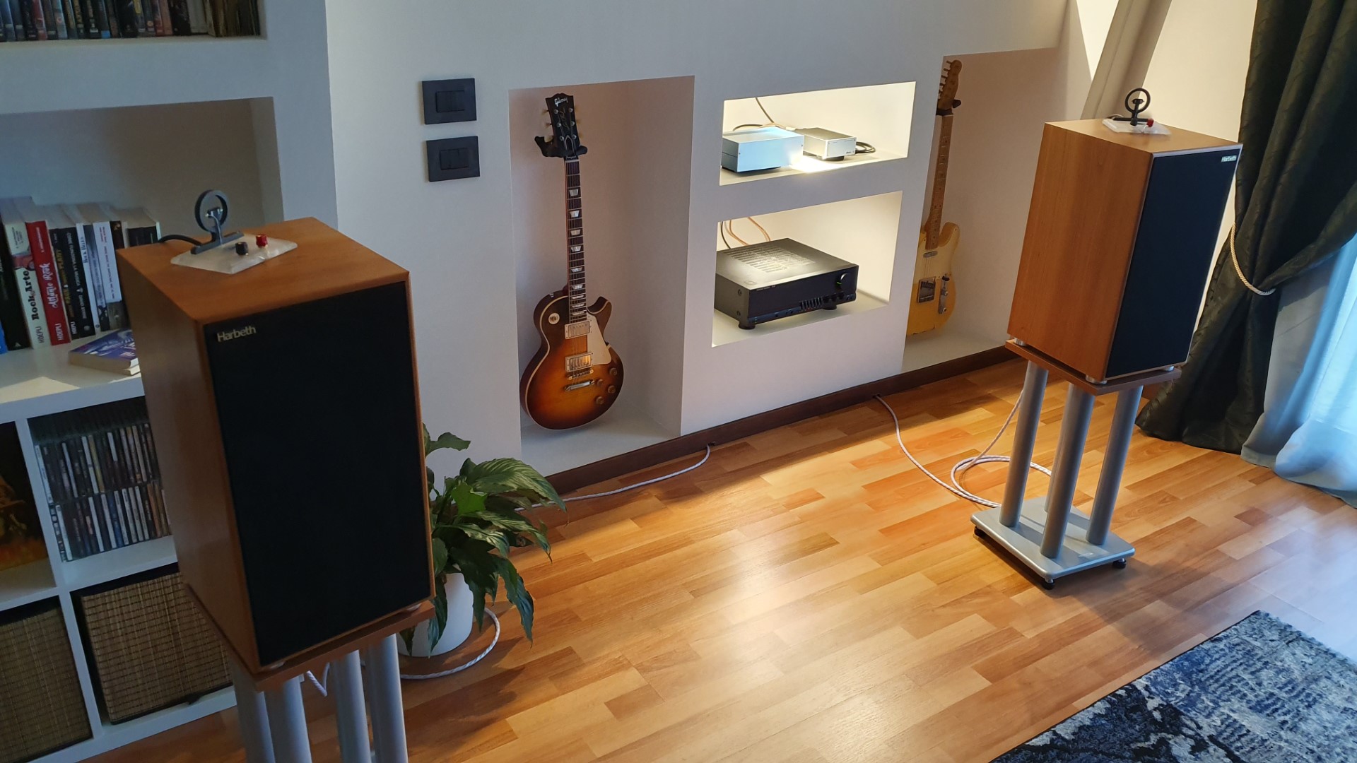 I diffusori non sono più a torre, ma sono da stand: Harbeth C7ES3, suono inglese di grande tradizione derivato dai progetti BBC e non particolarmente dedito alla frizzantezza, quanto più alla dolcezza e al minor affaticamento possibile, un approccio che comunque non è “carente”, piuttosto neutrale direi, con una stupenda gamma media.