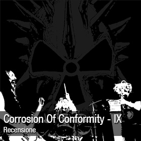 Tornano i Corrosion of Conformity dando alle stampe “IX”, il loro (appunto) nono album in studio, ormai il vecchio Pepper Keenan è sempre più perso nei suoi progetti paralleli, Down su tutti, ma ufficialmente non ha lasciato la band, che si presenta nuovamente nel terzetto originario (dopo il precedente album omonimo) con Mike Dean al basso e voce, Woody Weatherman alle chitarre e Reed Mullin dietro le pelli. Cosa aspettarsi dal nuovo lavoro di una band partita come hardcore, passata per il crossover thrash arrivando allo sludge/stoner?Inserito l’album (edito per Candlelight Records) nel lettore, veniamo subito travolti dai feedback e il wall of sound poderoso di “Brand New Sleep“, traccia cadenzata e pachidermica forte di un ottimo lavoro della sezione ritmica, con un basso imponente e una batteria decisamente massiccia. Le atmosfere stoner e 70ies di chiara matrice “sabbathiana” ritornano in brani come la successiva “Elphyn“, “The Hanged Man” e nell’acustica “Interlude“, evidente omaggio agli intermezzi acustici dei padri dello stoner/doom.L’anima primordiale della band si fa sentire in “Kill Denmark Vesey“, ottimo brano hardcore in stile C.o.C, breve e devastante con Dean che si sgola dietro al microfono e prosegue in “The Nectar“, uno degli episodi migliori del disco, che unisce l’anima più hardcore della band con quella più moderna e doom. L’abilità che ha reso famosi i Corrosion of Conformity nel coniugare tante influenze e stili diversi si ritrova anche nei riff e nelle variazioni di tempo di “Trucker” e “Tarquinius Superbus“, forti di una notevole componente aggressiva e sanguigna, grazie anche al rabbioso cantato e una potenza intrinseca che colpiscono dritto come una mazzata sulle gengive.La mancanza di Keenan si avverte in alcuni tratti ma l’album nel complesso è quadrato (grazie anche ad una buona produzione che esprime tutta la potenza di cui i tre sono capaci) e i brani sono forti di un’esperienza fuori dal comune. I Corrosion of Conformity confermano di essere la solita enorme macchina da riff e che la formula del terzetto può continuare a dare soddisfazioni, creando atmosfere marce, decadenti e oppressive, riuscendo ad inquadrare meglio gli intenti della band rispetto al precedente lavoro.Ci sono alcuni episodi meno coinvolgenti di altri, ma dopo una tanto onorata carriera e tante band che possono definirli padri putativi, risulta fisiologico e si può benissimo soprassedere. Consigliato a chiunque voglia sentire ancora musica onesta e senza mezzi termini, fatta da musicisti che non cercano certo il consenso comune e che non sono disposti a svendersi. Dopotutto da una band che si chiama Corrosion of Conformity, cosa ci si potrebbe aspettare se non questo?Pasquale Vaccaro