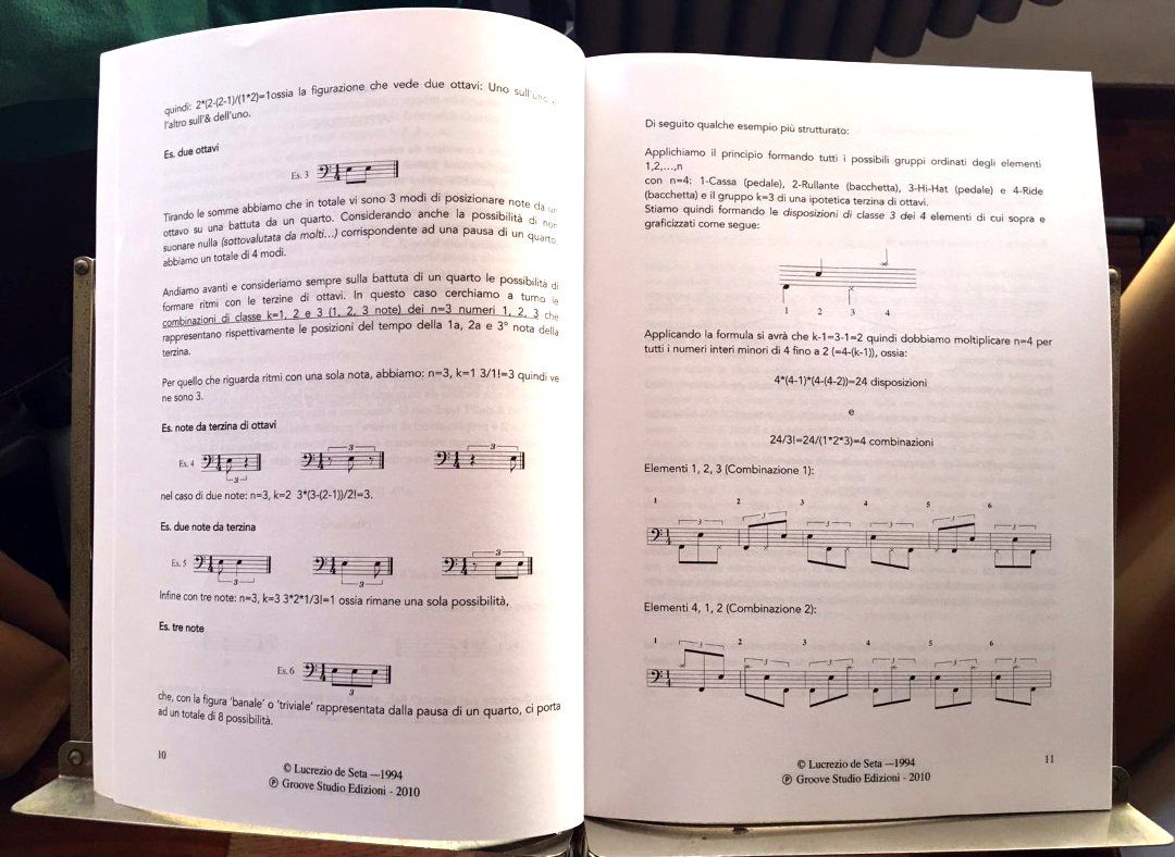 Ma niente paura se, come chi scrive, a scuola in matematica eravate scarsini o peggio: l’eventuale mancata comprensione dei concetti espressi nel capitolo iniziale non impedisce la possibilità di studiare con profitto il metodo in questione, la cui finalità ultima è favorire lo sviluppo di una consapevole concezione ritmica e di una tecnica adeguata, onde “ridurre al minimo il rischio di essere colti impreparati in una qualunque situazione creativa“.