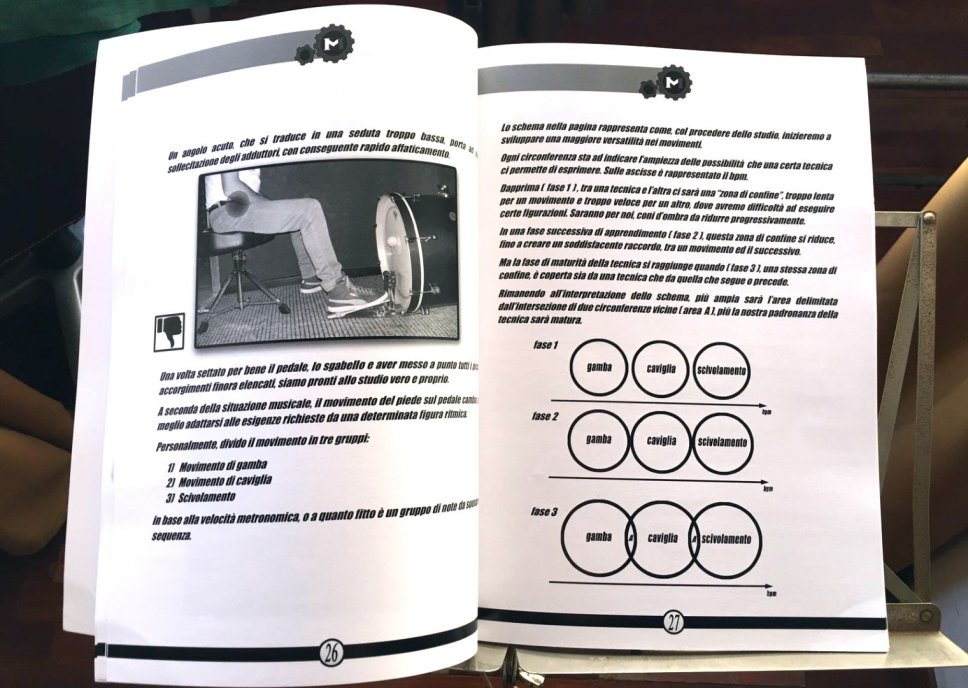 Orbene, Marco ha di recente dato alle stampe un metodo in cui concentra tutto quanto ha appreso sulla tecnica del pedale singolo in oltre 25 anni di studio e di professione. Totalmente autoprodotto, Studi sulla tecnica del pedale rappresenta, come enunciato dal sottotitolo, Una guida completa, dal settaggio alle tecniche esecutive.