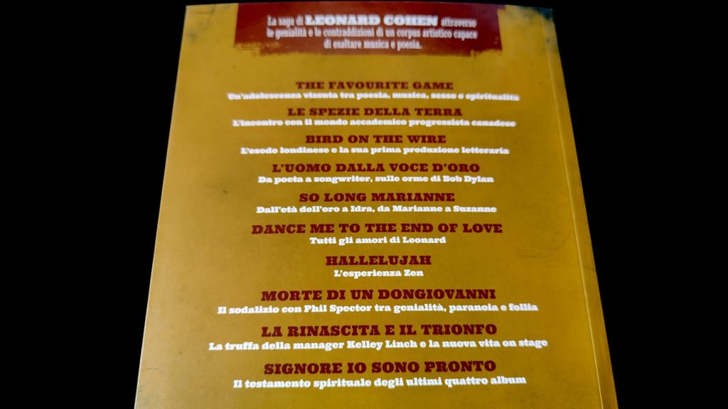In fondo al libro c’è, infine, l’utile discografia, dal primo disco del 1967, il celebre Songs of Leonard Cohen, fino all’ultima opera postuma del 2019, Thanks for the Dance. E poi i dischi dal vivo, le partecipazioni, le compilation, etc…