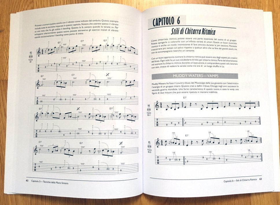 Inoltre una parte del libro viene dedicata ai chitarristi famosi del blues con dei lick derivati dal loro stile, analizzandone i linguaggi attraverso le apposite tablature. Ad esempio, come vedete nella foto, ci sarà Muddy Waters, il gigante del Blues elettrico di Chicago, a tenervi compagnia, insieme a molti altri suoi esimi colleghi.