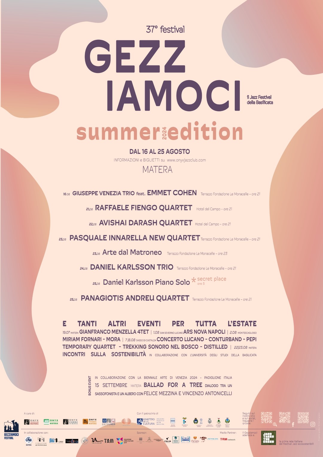 “Anche per il 2024 Gezziamoci vuole portare musica e qualità artistica, non solo a Matera ma in tutta la regione con quindici appuntamenti di alto valore culturale” spiega Kevin Grieco, condirettore artistico di Gezziamoci insieme a Gigi Esposito “il festival jazz di Onyx riesce a dare continuità ad un progetto artistico e culturale da quasi quarant’anni grazie all’impegno costante di una squadra ben affiatata che riesce sempre a rinnovarsi e ad aprire nuovi punti di vista, a proporre concerti di alto livello artistico e allo stesso tempo ad ascoltare le istanze delle comunità locali attraverso il confronto costante con le istituzioni e le associazioni del territorio. Quest’anno poi sarà possibile acquistare dei pacchetti per i concerti in programma dal 23 al 25 agosto per poter consentire al pubblico di non perdere nessun appuntamento della sessione materana e godere a pieno di tre giorni di musica e incontri sotto l’egida del jazz”.