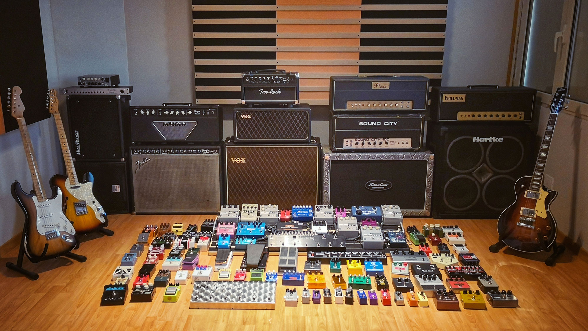 Sì, cerchiamo di emulare il più fedelmente possibile tutti gli amplificatori che hanno fatto la storia del rock e della musica moderna, in abbinamento anche a pedali altrettanto noti. In generale, a studio abbiamo una collezione enorme di pedali boutique e un notevole numero di amplificatori di riferimento, per cui abbiamo la possibilità di abbinarli a piacere.