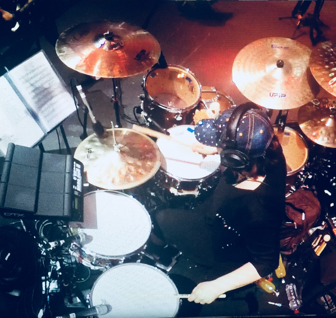 Yamaha DTX Multipad; in questo caso non posso non ringraziare Norberto Rizzi e Piero Panetta che in corsa, durante l’allestimento, hanno fatto il possibile per darmi lo strumento più adatto. Infine, ma non per ultimo, vorrei ringraziare Gianluca Aramini con la cui azienda ho iniziato a collaborare proprio in concomitanza di questo lavoro: ho utilizzato – e utilizzerò da qui a spero per sempre – bacchette Vic Firth American Classic e pelli REMO.
