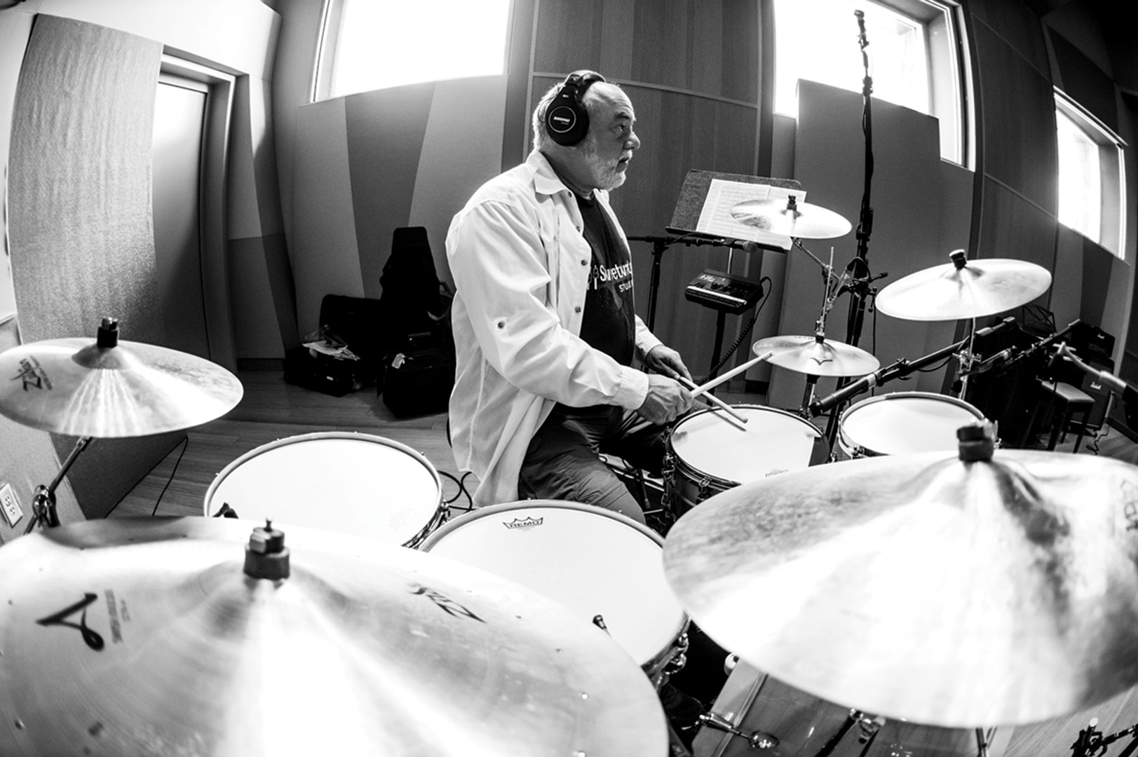 Nessun trucco speciale! Solo una grande batteria (Tama), i miei piatti preferiti (Zildjian) e pelli Remo. Dal punto di vista della registrazione, abbiamo evitato di processare troppo il suono e di combinare tra loro i riverberi. Mi piace un suono che sia presente, diretto, e che sia chiaro e caldo. Mi piace che la musica danzi e che il suono risplenda.