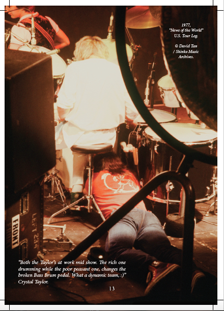 Arricchiscono la narrazione e l’imponente impianto iconografico (sono più di 170 le foto del batterista e dei suoi ‘ferri del mestiere’) due interviste, una allo stesso Roger Taylor e una al suo storico drum-tech, il quasi omonimo Chris “Christal” Taylor, che è anche il coordinatore per la logistica della band.