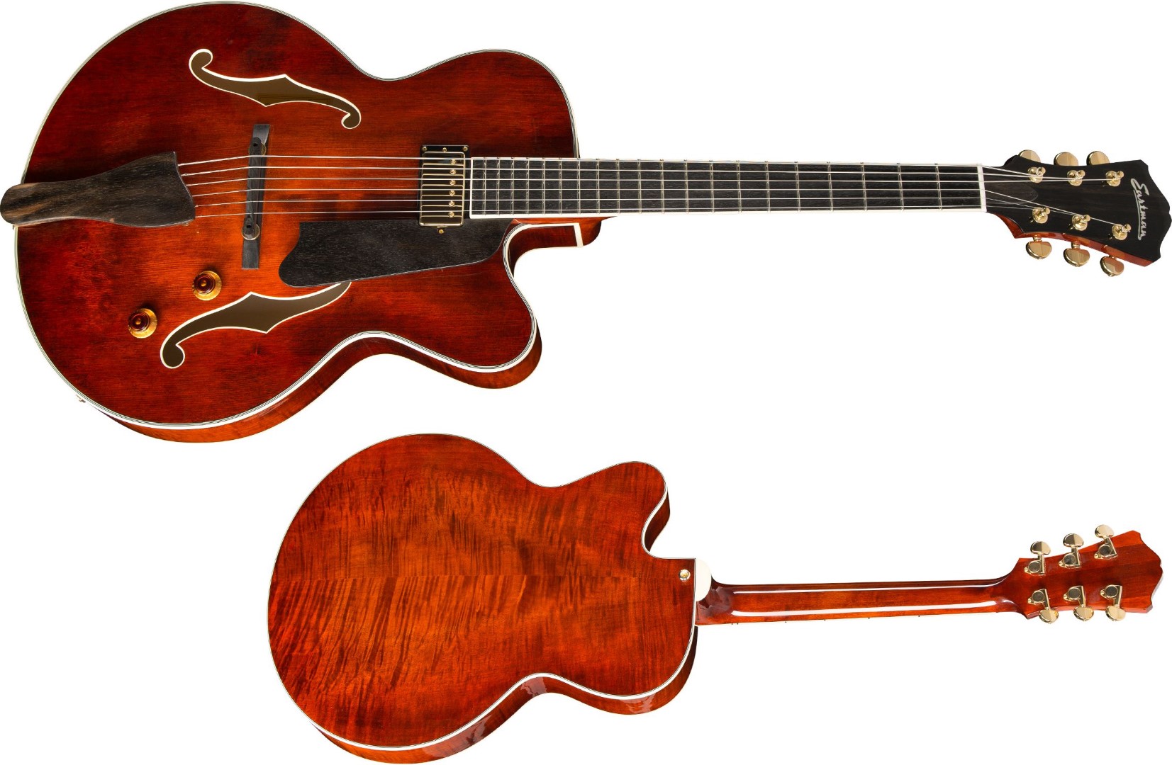 La prima delle due chitarre che potete ammirare nel video è basata sul modello 175 di Gibson.
