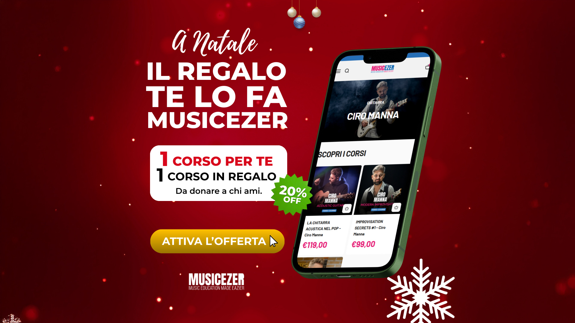 La promozione di Natale di Musicezer punta a trasformare il classico “sconto di fine anno” in un gesto di condivisione e affetto tra musicisti: chi acquista un corso ottiene il 20% di sconto e può regalare un secondo corso completo a un’altra persona, senza costi aggiuntivi.