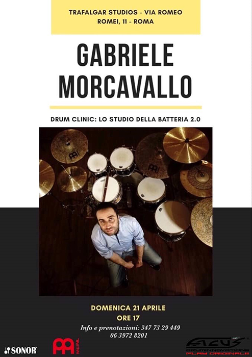 Lo studio della batteria 2.0 è il titolo della drum clinic che Gabriele Morcavallo terrà domenica 21 aprile alle 17 presso o Trafalgar Studios di via Romeo Romei 11 a Roma. Un incontro di due ore tra studi (ogni partecipante avrà la sua postazione pad e un set a disposizione), performance e routine progressive da integrare nel proprio diario di studi giornaliero per progredire con intelligenza e organicità. Il tutto sarà documentato dalle telecamere di CharlestonTV.