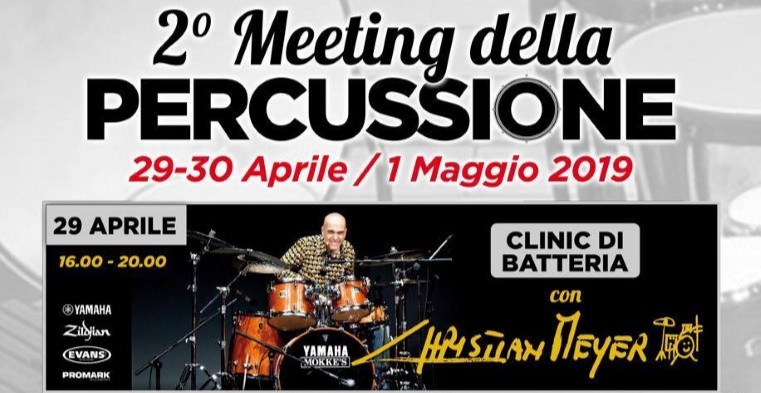 Per il II Meeting della Percussione che si terrà a Cassino (Frosinone) dal 29 aprile all’1 maggio organizzato da Musicalcentro, prevista una clinic di batteria con Christian Meyer (Elio e le Storie Tese, Trio Bobo) il 29 aprile dalle 16 alle 20 e i giorni successivi dalle 15 gli incontri con i Maestri della sezione Percussioni del Teatro San Carlo di Napoli, ossia Pasquale Bardaro, Franco Cardaropoli e Marco Pezzenati.