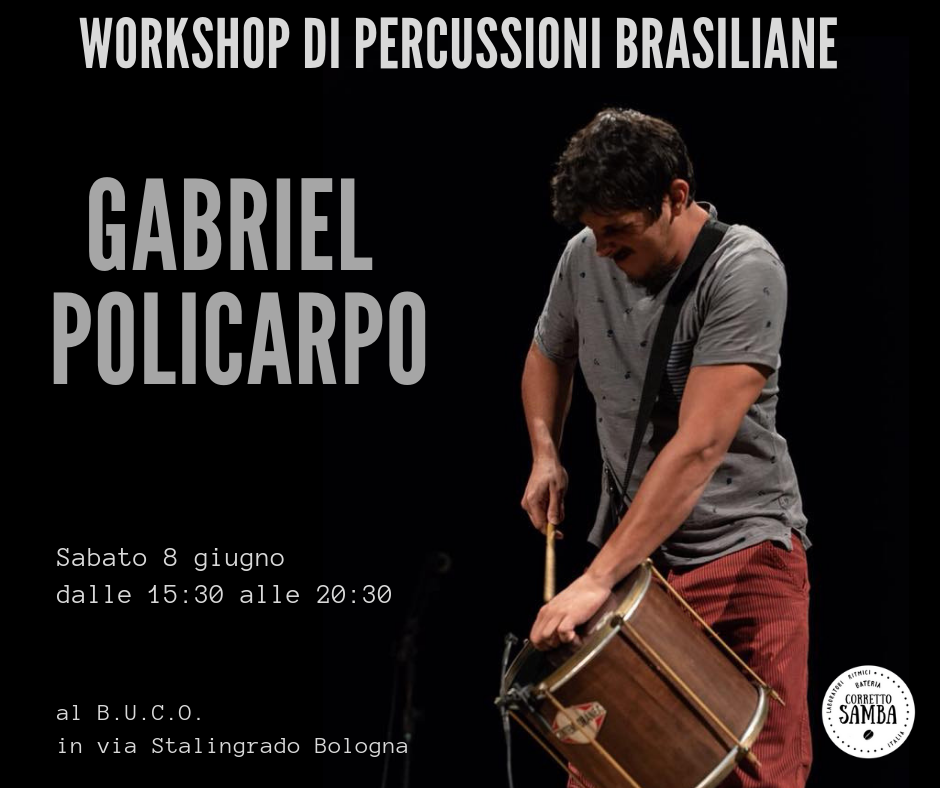 Workshop di percussioni brasiliane con Gabriel Policarpo sabato 8 giugno dalle 15 alle 20.30 al B.U.C.O di via Stalingrado a Bologna. Organizzato dal laboratorio ritmico Bateria Corretto Samba, l’incontro didattico farà conoscere a molti appassionati un percussionista virtuoso che si distingue per il suo modo creativo di suonare e dirigere. Policarpo è Primo Repique del bloco Unidos do Viradouro e Mestre de Batuquebato, attualmente in tour Europeo con Martinho da Vila.
